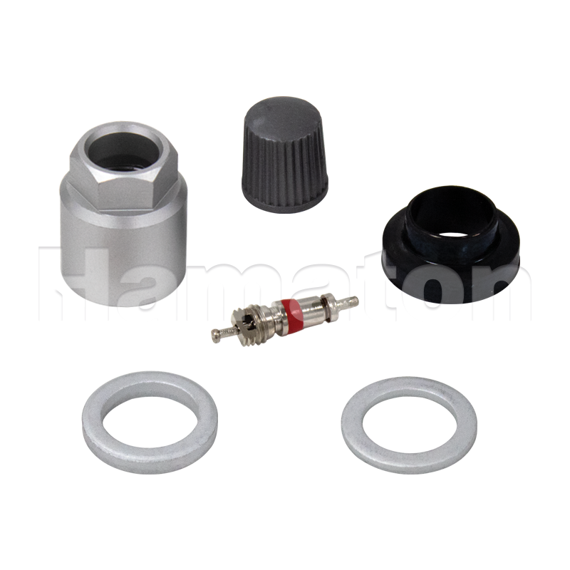 A box of 10 service kits with each including: 1 nut, 1 rubber grommet, 2 metal washers, 1 screw, 1 valve core, 1 anti-rotation pin and 1 valve cap