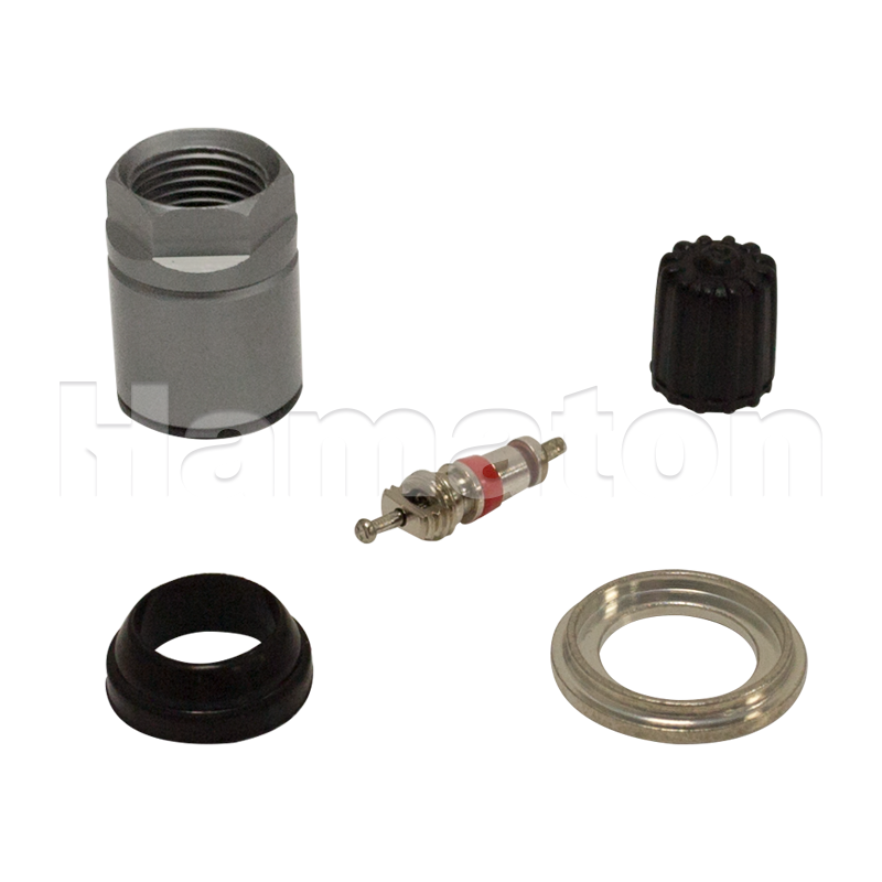 A box of 10 service kits, with each including: 1 nut, 1 rubber grommet, 1 plastic washer, 1 valve cap and 1 valve core.