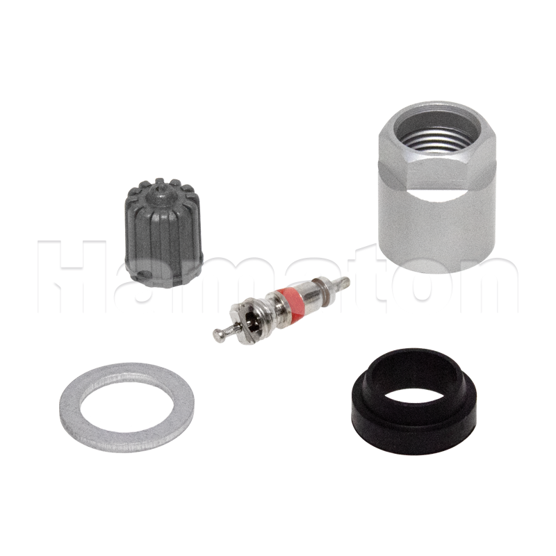 A box of 10 service kits, with each including: 1 nut, 1 rubber grommet, 1 plastic washer, 1 valve cap and 1 valve core.