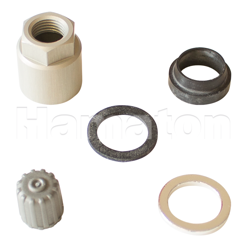 A box of 10 service kits, with each including: 1 nut, 1 rubber grommet, 1 plastic washer, 1 valve cap and 1 valve core.