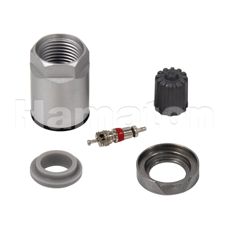 A box of 10 service kits, with each including: 1 nut, 1 rubber grommet, 1 plastic washer, 1 valve cap and 1 valve core.