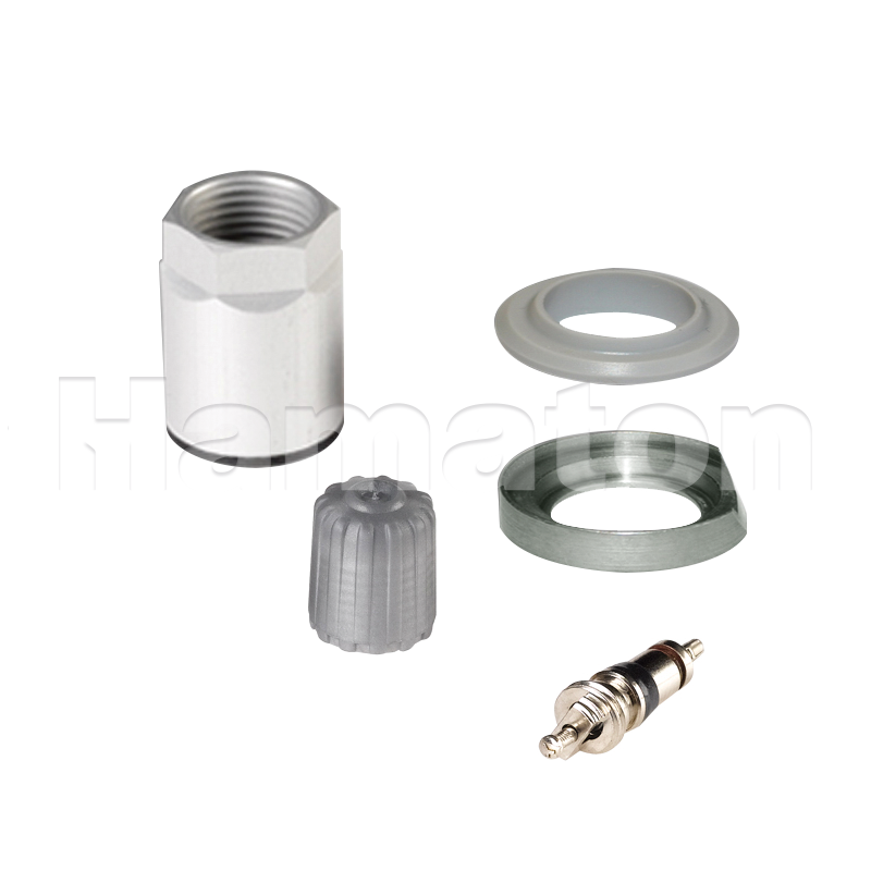 A box of 10 service kits, with each including: 1 nut, 1 rubber grommet, 1 metal washer, 1 valve cap and 1 valve core.