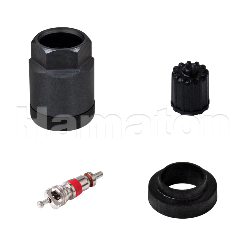 A box of 10 service kits, with each including: 1 Graphite Nut, 1 Rubber Grommet, 1 Plastic Washer, 1 Valve Cap and 1 Valve Core.